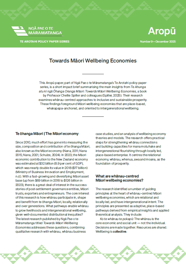 This Aropū paper, part of Ngā Pae o te Māramatanga’s Te Arotahi policy paper series, is a short impact brief summarising the main insights from Te Ahunga atu ki ngā Ōhanga Oranga Māori: Towards Māori Wellbeing Economies, a book by Professor Chellie Spiller and colleagues (Spiller, 2025). Their research examines whānau-centred approaches to inclusive and sustainable prosperity. These findings foreground Māori wellbeing economies that are place-based, whakapapa-anchored, and oriented to intergenerational wellbeing.